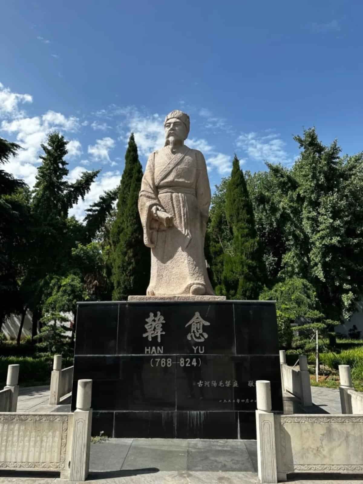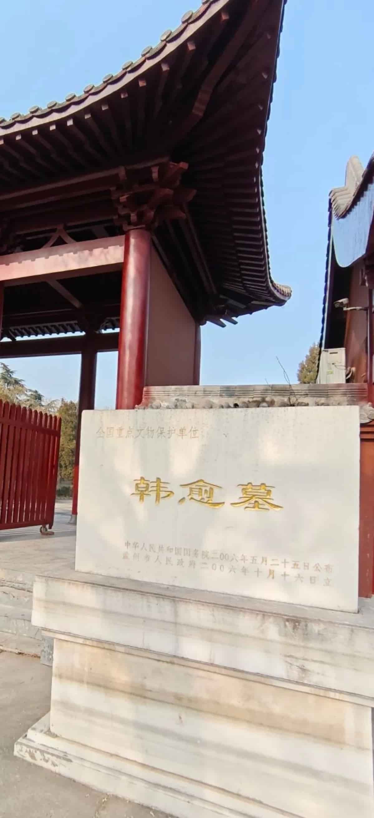 韩愈墓,位于河南省孟州市城西6公里韩庄村北半岭坡上,始建于唐敬宗宝历元年(825年),占地2万平方米。韩愈墓最前方是一座红色大理石镶嵌的“韩园”纪念碑。纪念碑之后,拾步42级台阶即是韩园的山门。陵园中央耸立着一座大型韩愈雕像。往北迎面即是拜堂,也称飨堂。飨堂后即是祠院。该殿面阔三间,砖木结构。进深4米,横宽11米,四梁八柱,方砖铺地,四壁镶嵌碑刻数通,记述墓祠兴衰、黎民捐资等历史事件。韩愈墓冢位于韩愈祠的中央,呈圆形。高10米,围长60余米。1984年6月,河南孟县(今孟州市)韩愈祠被河南省列为省级重点文物保护单位。1986年11月,韩愈墓被公布为河南省文物保护单位。2006年05月25日,韩愈墓作为唐代古墓葬,被国务院批准列入第六批全国重点文物保护单位名单。